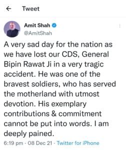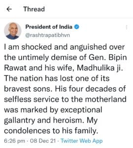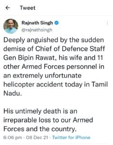 नई दिल्ली। आखिरकार देश के लिए बुरी खबर आ ही गई। एजेंसी की खबरों के मुताबिक जनरल बिपिन रावत नहीं रहे। वे देश के पहले चीफ ऑफ डिफेंस स्टाफ, यानी सीडीएस थे। तमिलनाडु के कुन्नूर में बुधवार दोपहर करीब 12 बजकर 20 मिनट पर उनका हेलिकॉप्टर क्रैश हो गया था। उसमें जनरल रावत की पत्नी मधुलिका रावत समेत सेना के 14 लोग सवार थे।