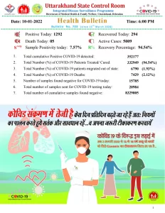 अभिज्ञान समाचार/ देहरादून। उत्तराखंड में कोरोना का कहर थमने का नाम नहीं ले रहा है। प्रदेश में हर रोज लगातार हजार से ज्यादा संक्रमण के नए मामले सामने आ रहे हैं। आज कोरोना के 1292 नए मामले सामने आए हैं। जबकि पिछले 24 घंटों में 05 लोगों की जान गई है। इनमे देहरादून के गवर्नमेंट दून मेडिकल कॉलेज में एक मरीज, एम्स ऋषिकेश में 3 और पौड़ी में एक मरीज की मौत हुई। वहीं 294 संक्रमित मरीज ठीक हुए हैं। लगातार बढ़ते मामलों के बीच प्रदेश में सक्रिय मरीजों का आंकड़ा 5009 पहुंच गया है।