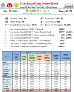 उत्तराखंड में आज शुक्रवार को एक बार फिर से कोरोना मरीजों के आंकड़ों में बढ़ोतरी हुआ। बता दें कि आज शुक्रवार को कोरोना के 20 मामले सामने आए हैं. वहीं पिछले 24 घंटे में किसी भी कोरोना मरीज की मौत नहीं हुई है। आपको बता दें कि आज 13 कोरोना के मरीज ठीक होकर घर लौटे हैं। वहीं बीते 24 घंटे में कोरोना के 20 मामले सामने आने के बाद राज्य में अब कोरोना के 155 एक्टिव केस रह गए हैं।