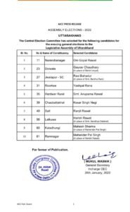 नई दिल्ली/ देहरादून। उत्तराखंड विधानसभा चुनाव के लिए कांग्रेस ने 10 और प्रत्याशियों की सूची जारी की है। इस सूची में कई सीटों पर पहले से तय प्रत्याशियों को बदला गया है। इस सूची मे हरीश रावत को पूर्व निर्धारित सीट रामनगर से हटाकर लालकुआँ सीट से उमीदवार बनाया गया है।