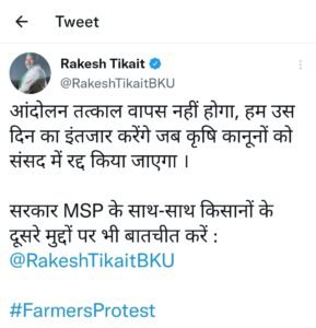 नई दिल्ली। शुक्रवार के दिन गुरु पर्व पर प्रधानमंत्री नरेंद्र मोदी ने राष्ट्र के नाम संबोधन में तीनों कृषि कानूनों को वापस लेने की घोषणा कर दी है। बावजूद इसके किसान आंदोलन को तुरंत वापस नहीं लेंगे। इसे लेकर भारतीय किसान यूनियन के प्रवक्ता राकेश टिकैत का बड़ा बयान सामने आया है। उन्होंने शुक्रवार को ट्वीट कर कहा कि “आंदोलन तत्काल वापस नहीं होगा। हम उस दिन का इंतजार करेंगे जब कानून को संसद में रद्द किया जाएगा और एमएसपी के साथ-साथ किसानों के दूसरे मुद्दों पर भी बातचीत करें।” टिकैत के इस बयान के बाद किसानों ने उनका समर्थन किया है।