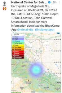 नेशनल सेंटर ऑफ सीस्मोलॉजी (एनसीएस) के मुताबिक, भूकंप की सूचना सुबह दो बजकर दो मिनट पर आई। भूकंप के झटके उत्तरकाशी जिले के कई हिस्सों में भी महसूस किए गए। भूकंप की तीव्रता 3.8 बतायी जा रही है। 05-12-2021 को देर रात 2 बजकर 2 मिनट 47 सेकंड पर भूकम्प आया। भूकंप का केंद्र टिहरी गढ़वाल बताया गया है और यह 10 किलोमीटर गहराई में था।