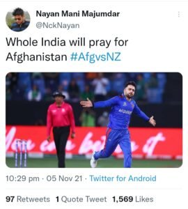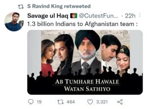स्कॉटलैंड के खिलाफ भारत की रणनीति सटीक रही। और भारत ने केवल 6.3 ओवर में 86 रनों के लक्ष्य का पीछा करते हुए बेहतर नेट रन रेट बनाने में कामयाबी हासिल की। लेकिन पाकिस्तान और न्यूजीलैंड से अपने पहले दो मुकाबले हारने के बावजूद भारत अभी भी सेमीफाइनल के लिए क्वालीफाई कर पाएगा यह बहुत कुछ अफगानिस्तान पर निर्भर करेगा? इसी को सोशल मीडिया पर मुद्दा बनाकर कई तरह के मीम्स तैयार हो रहे हैं। एक मीम में तो अफगानिस्तान के फिरकी गेंदबाज राशिद खान को टीम इंडिया के खिलाड़ी सैलून में सर्विसेज़ देते दिखाया गया है। तो वहीं कुछ ने भारत और अफगानिस्तान के बेहतर रिश्तों का हवाला देते हुए अफगानिस्तान की जीत की दुआ मांगी है।