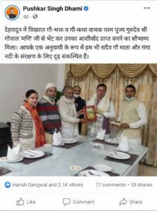 अभिज्ञान समाचार/ देहरादून। उत्तराखंड के मुख्यमंत्री पुष्कर सिंह धामी ने विख्यात गौभक्त व गौ कथा वाचक पूज्य श्री गोपाल ‘मणि’ महाराज से भेंटकर उनका आशीर्वाद प्राप्त किया। सीएम आवास पर मणि महाराज का स्वागत करते हुए मुख्यमंत्री ने कहा कि एक अनुयायी के रूप में वह सदैव गौ माता तथा गंगा नदी के संरक्षण के लिए दृढ़ संकल्पित हैं। सीएम पुष्कर सिंह धामी ने फेसबुक पर पूज्य गोपाल मणि महाराज के साथ फोटोग्राफ पोस्ट कर अपना अनुभव साझा किया। गोपाल मणि महाराज से बातचीत के दौरान मुख्यमंत्री ने राज्य में गौ संरक्षण के लिए किए जा रहे प्रयासों पर चर्चा की। इस दौरान पूज्य महाराज के महासंकल्प गौ माता राष्ट्र माता के विषय पर भी चर्चा हुई। सीएम ने इस दिशा में कार्य करने की प्रतिबद्धता दोहराई। इस अवसर पर मणि महाराज ने मुख्यमंत्री धामी को धेनुमानस ग्रंथ भेंट किया।