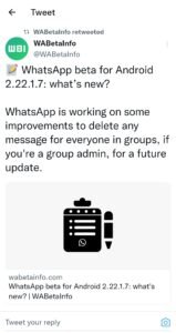 जिसमें ग्रुप के एडमिन को ग्रुप के किसी भी मैसेज को डिलीट करने का अधिकार दिया जाएगा इस फीचर के आने के बाद ग्रुप एडमिन कोई भी मैसेज अपने पास रख सकता है और किसी के मैसेज को डिलीट भी कर सकता है.इस फीचर को लेकर टेस्टिंग शुरू हो गई है. जल्द ही इसे सभी यूजर्स के लिए जारी कर दिया जाएगा. सभी एडमिन के पास सभी के लिए मैसेज डिलीट करने का अधिकार Wabetainfo की रिपोर्ट के मुताबिक, कंपनी ने इस फीचर के लिए बीटा वर्जन 2.22.1.1 अपडेट जारी किया है, जो ग्रुप एडमिन को ग्रुप में दूसरे मेंबर्स द्वारा डाले गए मैसेज को डिलीट करने की सुविधा देता है. ग्रुप के सभी एडमिन के पास सभी के लिए मैसेज डिलीट करने का अधिकार होगा।