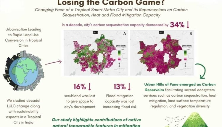 देहरादून – 23 मई 2025: पुणे ने बीते दस सालों में अपनी कार्बन सीक्वेस्ट्रेशन क्षमता में 34 प्रतिशत की गिरावट दर्ज की है, जो मुख्य रूप से तेज़ी से शहरी विकास की वजह से हुआ है। हाल ही में एमआईटी-वर्ल्ड पीस यूनिवर्सिटी के डॉ. पंकज कोपार्डे तथा सस्टेना ग्रीन्स एलएलपी की प्रतीक्षा चालके द्वारा साथ मिलकर की गई एक स्टडी के नतीजे में शहर की कार्बन डाइऑक्साइड (CO₂) नामक एक प्रमुख ग्रीनहाउस गैस को सोखने की क्षमता में इतनी बड़ी गिरावट की बात सामने आई है। “लूजिंग द कार्बन गेम? चेंजिंग फेस ऑफ ए ट्रॉपिकल स्मार्ट मेट्रो सिटी एंड इट्स रेपरकशंस ऑन कार्बन सीक्वेस्ट्रेशन, हीट एंड फ्लड मिटिगेशन कैपेसिटी” नाम से यह रिसर्च सस्टेनेबल फ्यूचर्स जर्नल में प्रकाशित की गई थी।