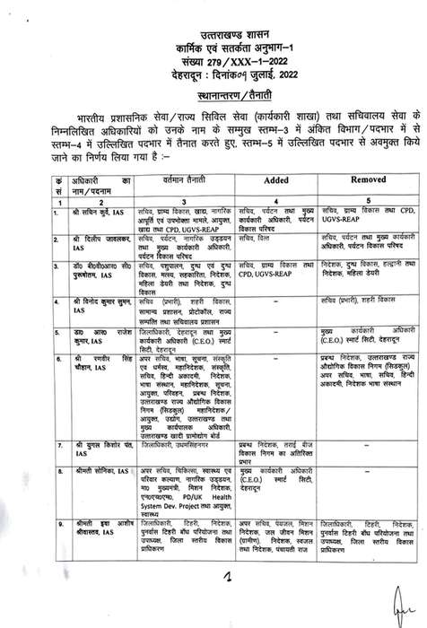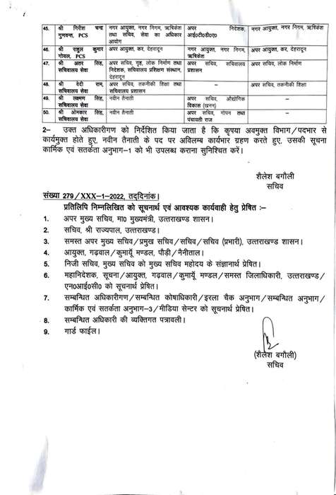 देहरादून। मुख्यमंत्री पुष्कर सिंह धामी समय-समय पर नौकरशाही में बदलाव कर सुशासन को और मजबूत बनाने के प्रयासों में जुटे हैं। इसी कड़ी में शनिवार देर शाम शासन ने एक साथ 50 आईएएस और पीसीएस अधिकारियों के तबादले किए हैं। जानिए किसे कहाँ मिली तैनाती।