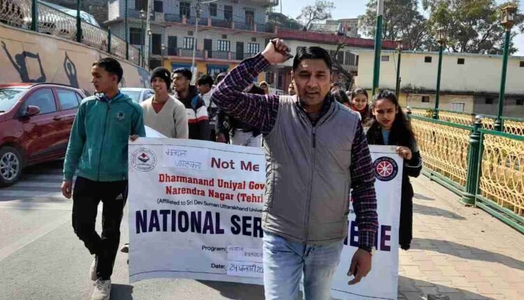 नरेन्द्र नगरI मतदाता जागरूकता अभियान के अंतर्गत धर्मानंद उनियाल राजकीय महाविद्यालय की राष्ट्रीय सेवा योजना इकाई के छात्र/छात्राओं ने नरेन्द्रनगर टिहरी गढ़वाल जिला प्रशासन के सहयोग से कार्यक्रम अधिकारी डॉ संजय कुमार के नेतृव मे रैली निकालकर आमजन को मतदान के लिए जागरूकता अभियान चलायाI
