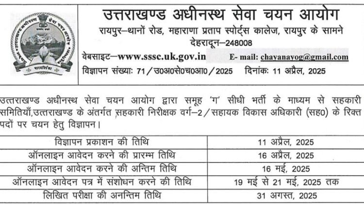 16 अप्रैल से इसके लिए आयोग की ऑफिशियल वेबसाइट uksssc.co.in फॉर्म लिंक खुल गया है। जिससे आप सीधे इस सरकारी वैकेंसी में अप्लाई कर सकते हैं। लास्ट डेट 16 मई 2025 है। आवेदन शुल्क भरने की भी लास्ट डेट यही है। फॉर्म में करेक्शन करने की विंडो 19-21 मई तक खुलेगी। सहायक विकास अधिकारी ग्रुप ‘सी’ की यह रिक्तियां उत्तराखंड की सहकारी समितियों में भरी जाएंगी।