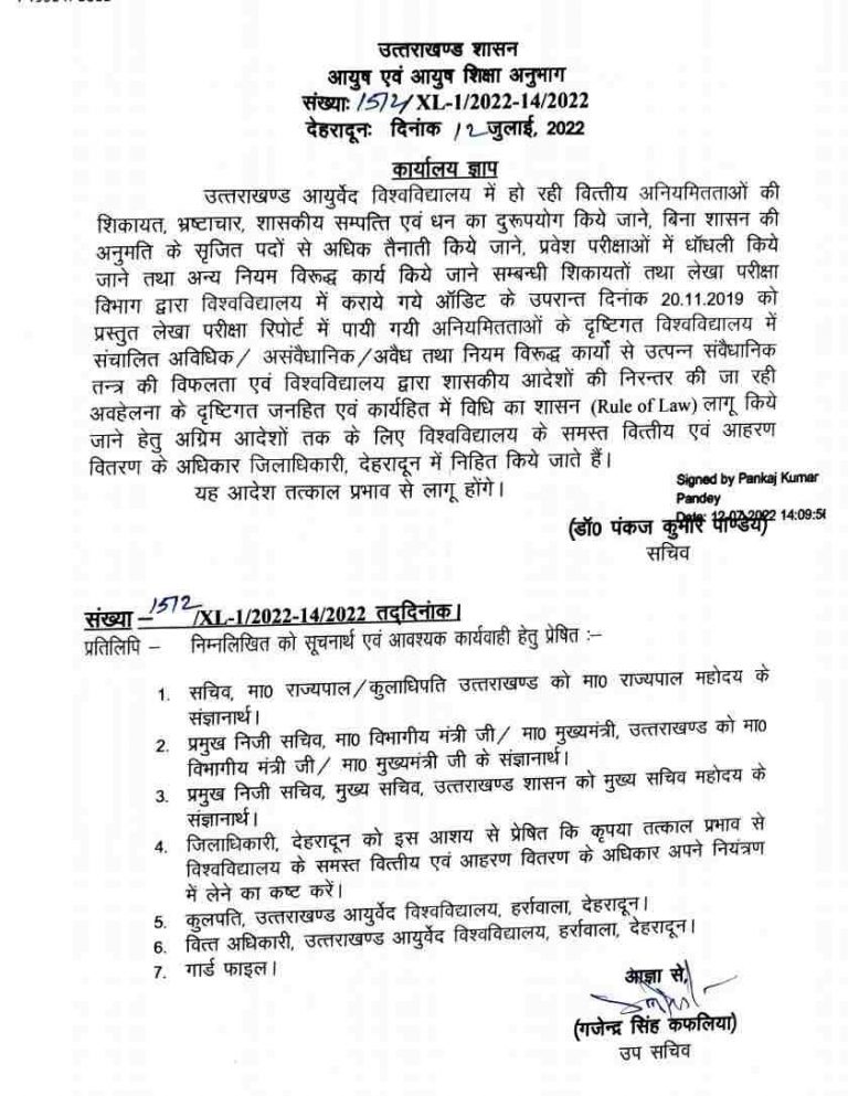 देहरादून। कई वित्तीय अनियमितताओं के चलते चर्चाओं में रहे उत्तराखंड आयुर्वेद विश्वविद्यालय को लेकर शासन ने सख्त कदम उठाते हुए विवि के समस्त वित्तीय आहरण के अधिकार सीज कर दिए हैं। उत्तराखंड शासन की ओर से स्वास्थ्य सचिव डॉ पंकज कुमार पांडे ने इसके आदेश जारी कर दिए हैं। स्वास्थ्य सचिव ने आदेश जारी कर जनहित एवं कार्यहित में विधि के शासन को लागू करते हुए अग्रिम आदेशों तक सभी अधिकार जिलाधिकारी देहरादून को सौंप दिए हैं।