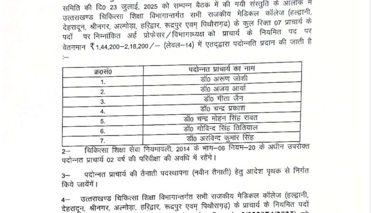 उत्तराखण्ड चिकित्सा शिक्षा विभागान्तर्गत सभी राजकीय मेडिकल कॉलेजों—हल्द्वानी, देहरादून, श्रीनगर, अल्मोड़ा, हरिद्वार, रूद्रपुर एवं पिथौरागढ़—में प्राचार्य के 7 रिक्त नियमित पदों पर योग्य प्रोफेसरों एवं विभागाध्यक्षों को पदोन्नति प्रदान की गई है।