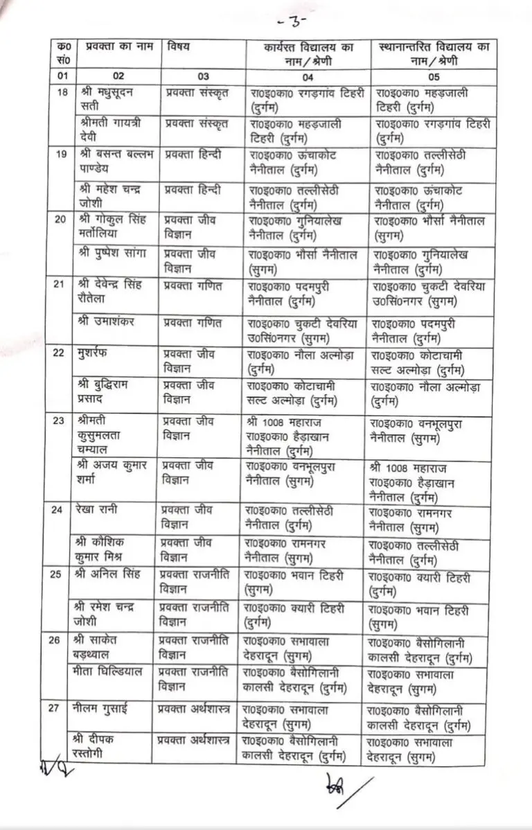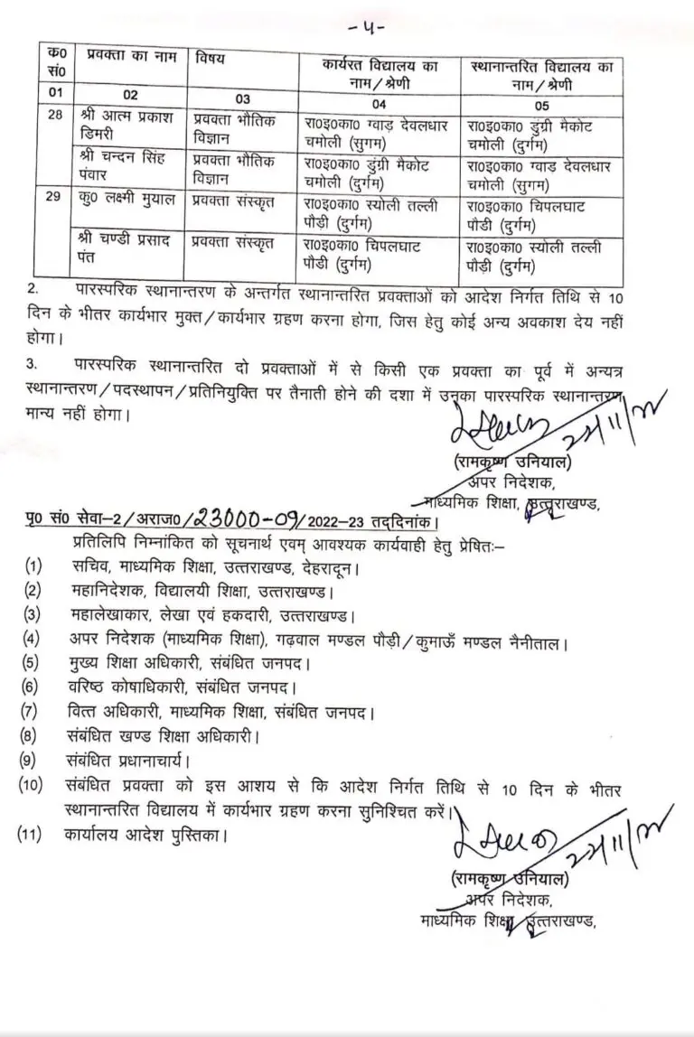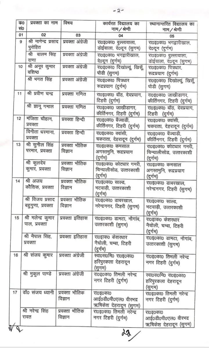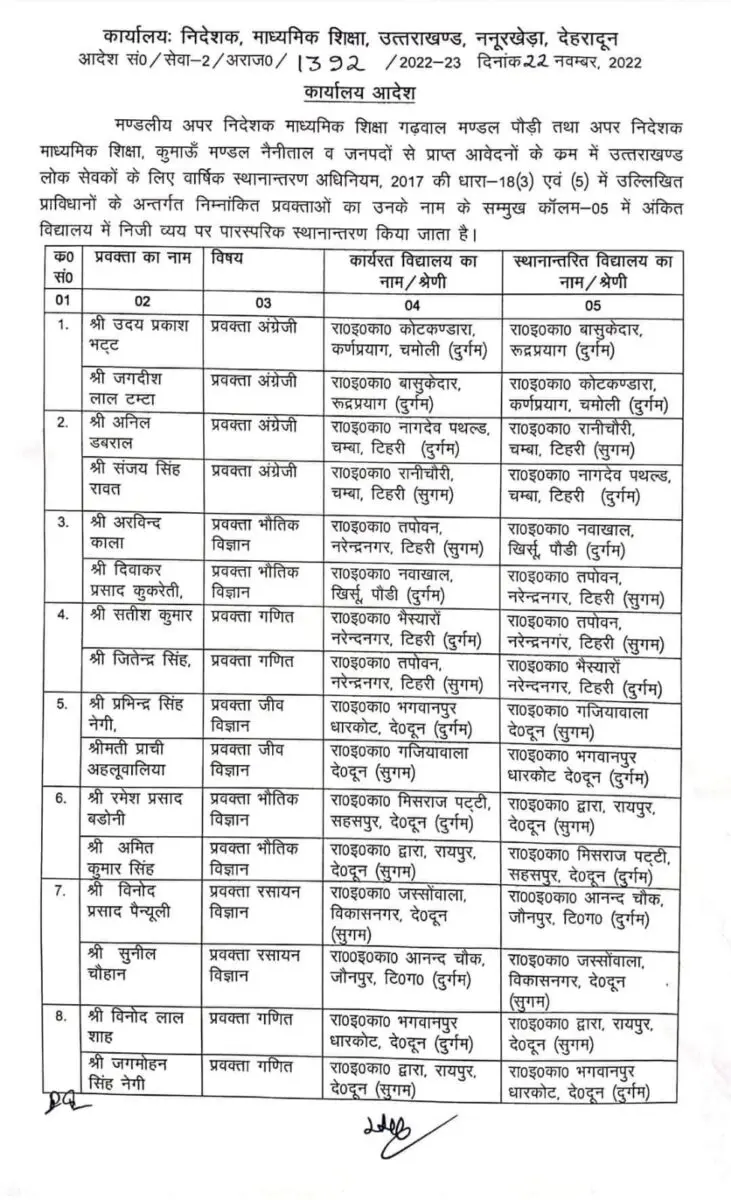 देहरादून। शिक्षा विभाग से बड़ी खबर आ रही है। दरअसल माध्यमिक शिक्षा निदेशक ने गढ़वाल मंडल के पौड़ी और अपर निदेशक माध्यमिक शिक्षा कुमाऊं ने कुमाऊं मंडल के नैनीताल व अन्य जनपदों से प्राप्त आवेदनों के चलते पारस्परिक स्थानांतरण कर दिए हैं। यह ट्रांसफर उत्तराखंड लोक सेवकों के लिए वार्षिक स्थानांतरण अधिनियम 2017 में उल्लेखित प्रावधानों के अंतर्गत प्रवक्ताओं के पारस्परिक स्थानांतरण किए गए हैं।