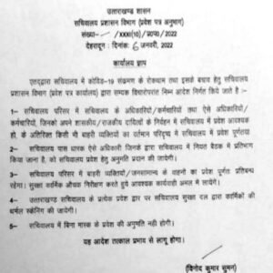 Breaking news: सचिवालय में अधिकारियों और कर्मचारियों को छोड़ जन सामान्य के प्रवेश पर प्रतिबंध