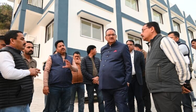 पुरूकुलगांव में निर्माणाधीन सामुदायिक भवन का निरीक्षण करते कैबिनेट मंत्री गणेश जोशी