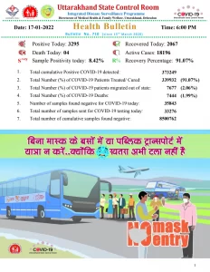 अभिज्ञान समाचार/ देहरादून। उत्तराखंड में कोरोना का कहर थम नही रहा। आज प्रदेश में कोरोना के 3295 नए मामले सामने आए हैं। जबकि 2067 संक्रमित मरीज रिकवर हुए हैं। लगातार बढ़ते मामलों के बीच इसमे प्रदेश में सक्रिय मरीजों का आंकड़ा 18,196 तक जा पहुंचा है।जबकि पिछले चौबीस घंटों में चार कोरोना मरीजों की मौत हुई है। इनमे एक एम्स ऋषिकेश, एक हिमालयन हॉस्पिटल देहरादून, एक महंत इंद्रेश हॉस्पिटल देहरादून और एक मौत डॉक्टर सुशीला तिवारी गवर्नमेंट हॉस्पिटल हल्द्वानी में हुई है।