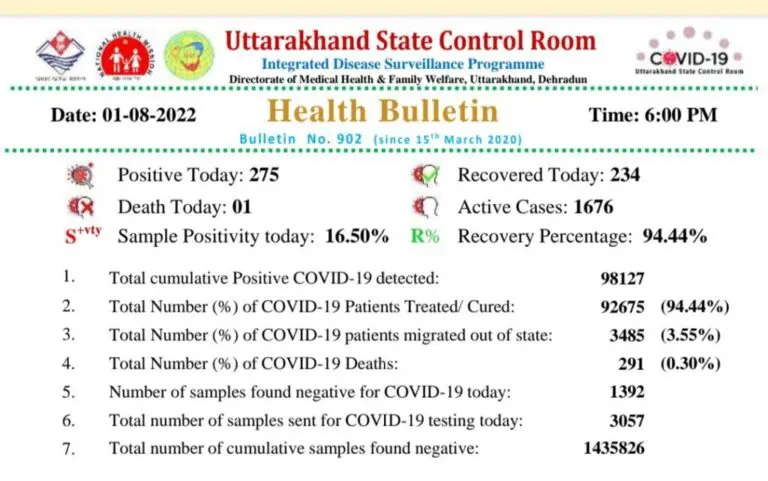 उत्तराखंड में अब एक्टिव मरीजों की संख्या 1676 पहुंच गई है। स्वास्थ्य विभाग द्वारा आज जारी हेल्थ बुलेटिन के अनुसार पिछले 24 घण्टों में 275 लोग कोरोना से संक्रमित पाए हैं। जबकि 234 मरीज स्वस्थ हुए हैं। अन्य दिनों की भांति आज भी देहरादून में सर्वाधिक 108 लोग कोरोना संक्रमित मिले, जबकी सबसे कम पौड़ी, उत्तरकाशी और रुद्रप्रयाग जिले में एक- एक संक्रमित पाए गए। इसके साथ ही हरिद्वार में 60, नैनीताल में 61, उधमसिंह नगर में 7,  टिहरी में 9, चंपावत में 11, अल्मोड़ा में 11, बागेश्वर में 3, चमोली  में 2 कोरोना पॉजिटिव मिले हैं।
