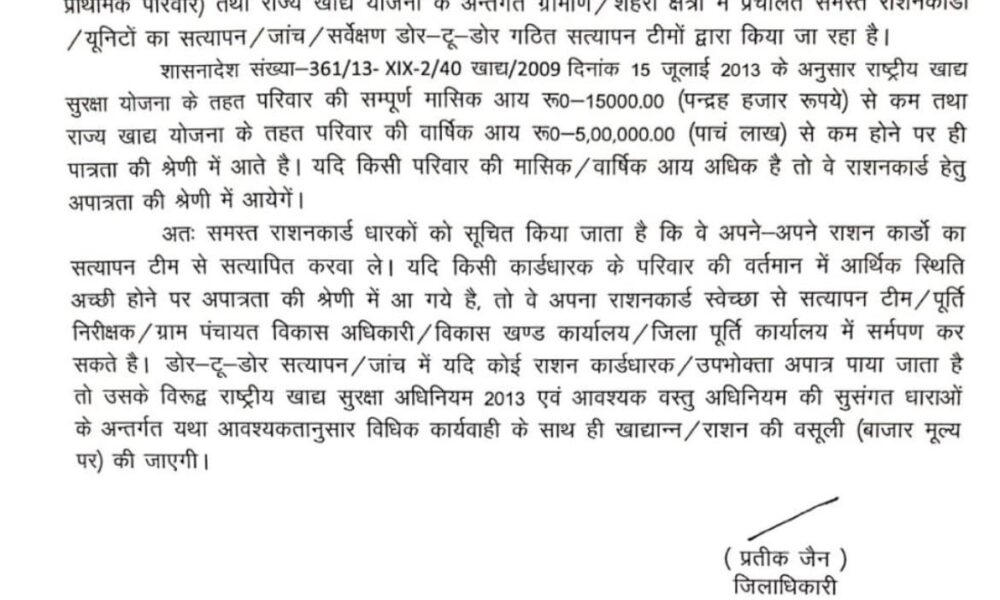 जिला प्रशासन ने स्पष्ट किया है कि सत्यापन के दौरान यदि कोई राशन कार्डधारक अपात्र पाया जाता है, तो उसके विरुद्ध राष्ट्रीय खाद्य सुरक्षा अधिनियम, 2013 और आवश्यक वस्तु अधिनियम की सुसंगत धाराओं के अंतर्गत विधिक कार्रवाई की जाएगी। साथ ही वितरित खाद्यान्न की वसूली बाजार दर पर की जाएगी।