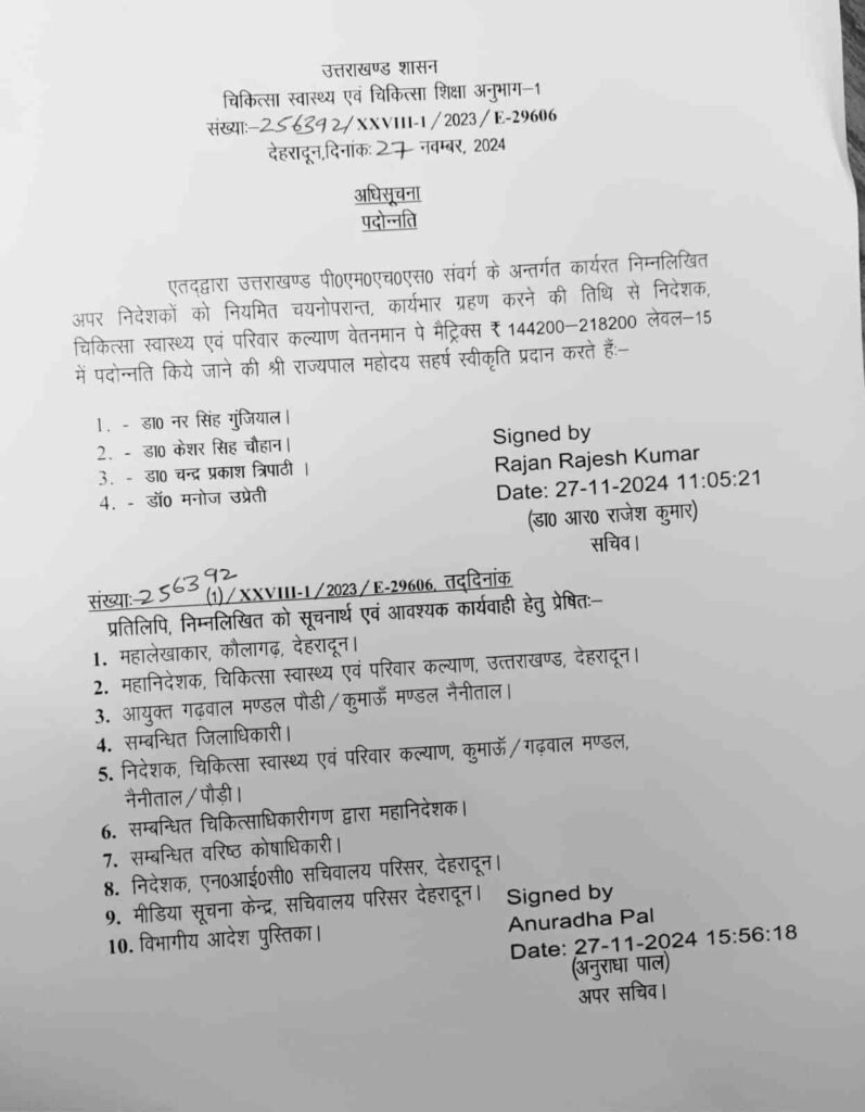 प्रमोशन पाने वालों में डा० नर सिंह गुंजियाल, डा० केशर सिह चौहान, डा० चन्द्र प्रकाश त्रिपाठी डॉ० मनोज उप्रेती शामिल हैं। सभी चिकित्सकों को 144200-218200 लेवल-15 का वेतनमान मिलेगा।