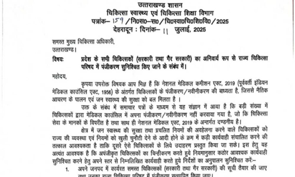 देहरादून: उत्तराखंड सरकार ने राज्य में चिकित्सा सेवा की गुणवत्ता को बेहतर बनाने और आम जनता की स्वास्थ्य सुरक्षा सुनिश्चित करने के लिए एक बड़ा और ऐतिहासिक कदम उठाया है। अब प्रदेश के किसी भी चिकित्सक, चाहे वह सरकारी सेवा में हो या निजी क्षेत्र में कार्यरत बिना पंजीकरण या नवीनीकरण के प्रैक्टिस नहीं कर सकेगा।