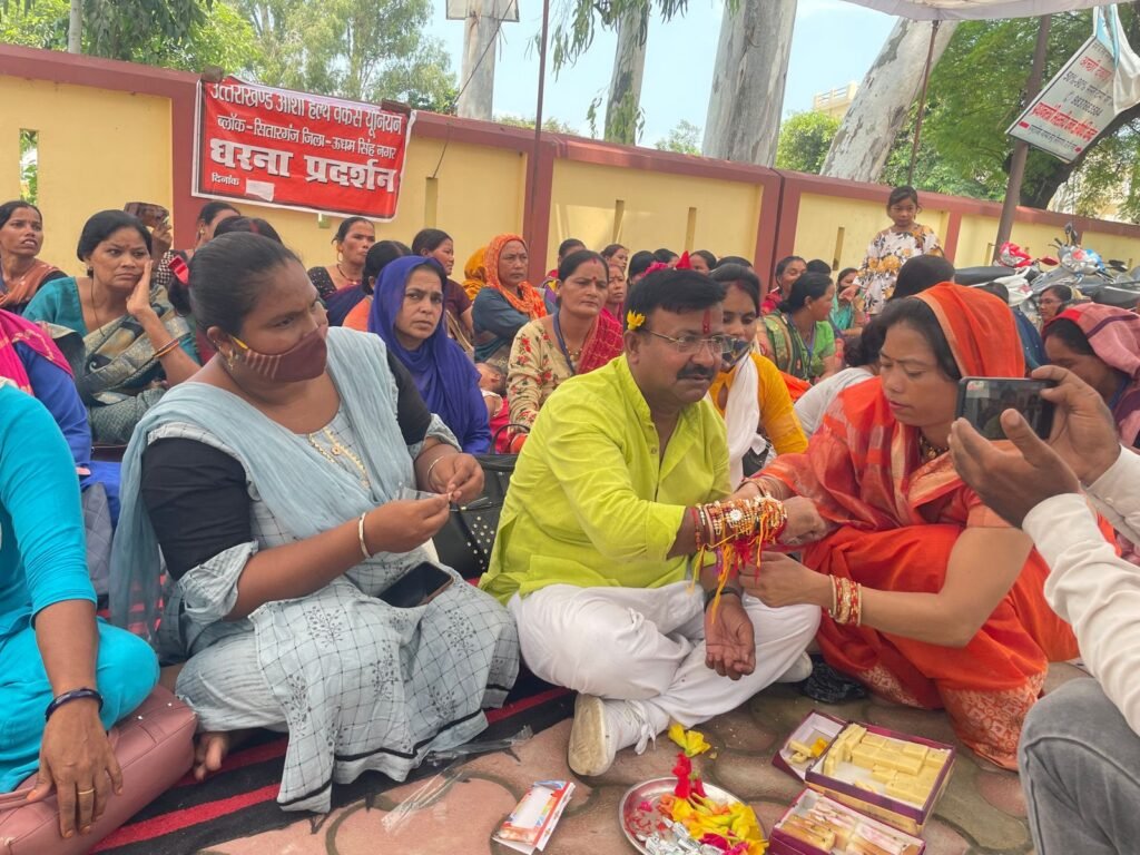 सितारगंज में रक्षाबंधन के दिन भी आंदोलन पर डटी रहीं आशाएं, आप नेता जायसवाल ने धरनास्थल पर ही बंधवाया रक्षा सूत्र