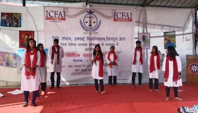देहरादून। कानूनी अधिकार एक ऐसा हथियार है जिसके द्वारा लोकतंत्र में हिंसा और अपराध के विरुद्ध लड़ा जा सकता है। और इसी कानूनी अधिकार के प्रति जागरूक करने के लिए इक्फ़ाई विवि के विधिक सहायता प्रकोष्ठ ने जागरूकता शिविर का आयोजन किया। भाऊवाला के रामपुर ग्राम पंचायत में आयोजित इस शिविर में महिलाओं, बच्चों एवं पिछड़ों के कई कानूनी अधिकारों के बारे में स्थानीय लोगों को जागरूक किया गया। पूरे कार्यक्रम में विवि के छात्रों द्वारा मंचित नुक्कड़ नाटक मुख्य आकर्षण का केंद्र रहा।