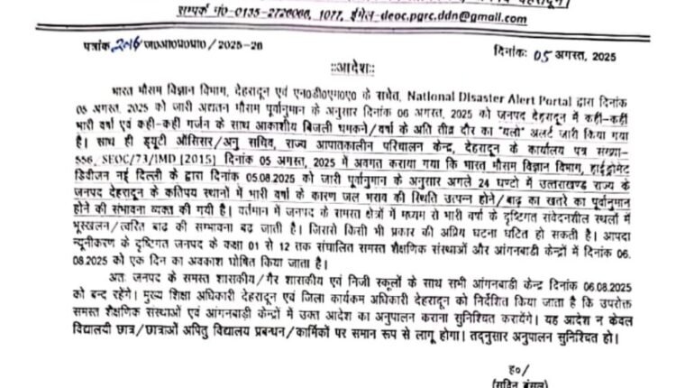 उत्तराखण्ड में बारिश का कहर जारी है। जिसे देखते हुए जहां शासन प्रशासन अलर्ट मोड पर आ गया है वहीं उत्तरकाशी के हरसिल धराली में हुई जल प्रलय से समूचे देश प्रदेश में हड़कंप मचा हुआ है। इसी बीच इस वक्त की सबसे बड़ी खबर स्कूलों एवं आंगनबाड़ी केंद्रों के संबंध में सामने आ रही है। बताया गया है कि उत्तरकाशी जिले में हुई बादल फटने अतिवृष्टि की घटना को देखते हुए उत्तरकाशी के अपर जिला मजिस्ट्रेट ने बुधवार 6 अगस्त को जिले के सभी विद्यालयों एवं आंगनबाड़ी केंद्रों में एक दिवसीय अवकाश घोषित कर दिया है।