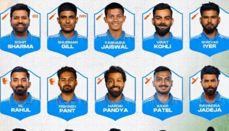 रोहित शर्मा (कप्तान), विराट कोहली, शुभमन गिल (उपकप्तान), श्रेयस अय्यर, केएल राहुल, हार्दिक पांड्या, अक्षर पटेल, वॉशिंगटन सुंदर, कुलदीप यादव, जसप्रीत बुमराह, मोहम्मद शमी, अर्शदीप सिंह, यशस्वी जायसवाल, ऋषभ पंत, रवींद्र जडेजा।