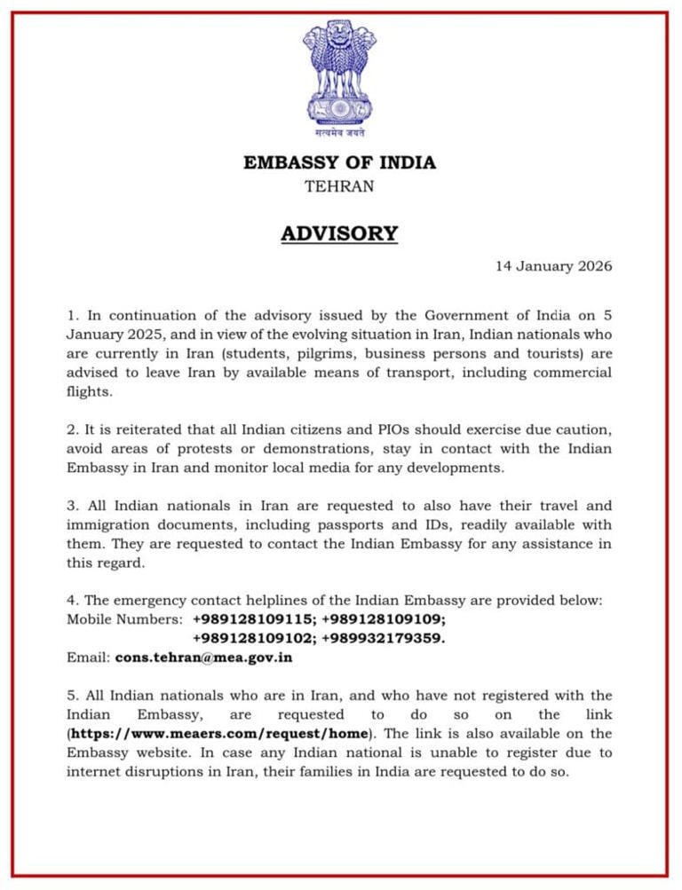 ईरान में बिगड़ते सुरक्षा हालात को देखते हुए भारत सरकार ने वहां रह रहे भारतीय नागरिकों के लिए एक अहम एडवाइजरी जारी की है। तेहरान स्थित भारतीय दूतावास ने सभी भारतीयों और भारतीय मूल के लोगों और PIO से आग्रह किया है कि वे उपलब्ध साधनों, खासकर कमर्शियल फ्लाइट्स के जरिए, जल्द से जल्द ईरान छोड़ दें। दूतावास की ओर से जारी बयान में कहा गया है कि क्षेत्र में बढ़ते तनाव, संभावित सैन्य गतिविधियों और देश के कई हिस्सों में जारी विरोध प्रदर्शनों के चलते सुरक्षा स्थिति लगातार बदल रही है। इसी वजह से यह चेतावनी जारी की गई है।