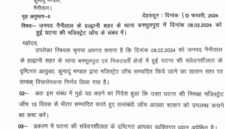 हल्द्वानी में 8 फरवरी को हुई हिंसा की मजिस्ट्रियल जांच होगी। इसका आदेश जारी कर दिया गया है। मुख्य सचिव की ओर से जारी आदेश में जांच को लेकर जानकारी दी गई है। मुख्य सचिव ने कुमाऊं कमिश्नर को जांच के लिए आदेश दिए हैं। साथ ही 15 दिन में रिपोर्ट सौंपने को कहा है।