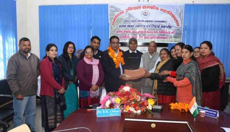 नरेंद्रनगर। पीजी कॉलेज रुद्रपुर में प्राचार्य के पद पर प्रोन्नति के साथ स्थानांतरण के फलस्वरुप स्टाफ क्लब राजकीय महाविद्यालय नरेंद्रनगर ने प्राचार्य प्रो राजेश कुमार उभान के सम्मान में भव्य विदाई समारोह का आयोजन किया।