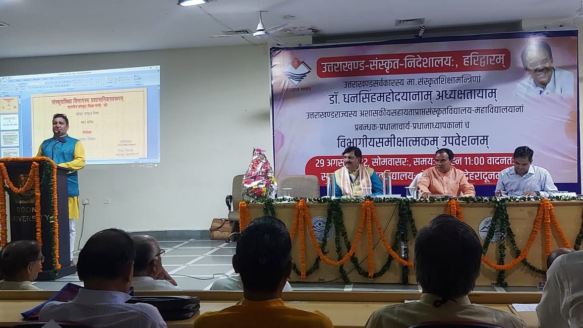 दून विश्वविद्यालय के सभागार में पूरे राज्य के शासकीय अशासकीय सहायता प्राप्त संस्कृत विद्यालयों महाविद्यालय के प्रधानाचार्य प्रबंधकों एवं पूरे राज्य के अधिकारियों के साथ समीक्षा बैठक मे बोल रहे थे