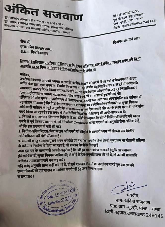 टिहरी गढ़वाल: समाजसेवी एवं पूर्व नामित सभासद अंकित सजवान द्वारा श्री देव सुमन विश्वविद्यालय(SDSUV) के कुलसचिव को दिए ज्ञापन में विश्वविद्यालय पर काफ़ी गंभीर आरोप लगाये गए है, अंकित द्वारा आरोप लगाया गया कि विश्वविद्यालय प्रशासन द्वारा विश्वविद्यालय परिसर में विगत वर्षों में विधायक निधि एवं ब्लॉक चंबा द्वारा एक भवन का निर्माण किया गया था। इस निर्माण हेतु श्री देव सुमन विश्वविद्यालय द्वारा पूर्व में ‘अनापत्ति प्रमाणपत्र’ (NOC) निर्गत किया गया था, जिसके उपरांत मुख्य विकास अधिकारी (CDO) एवं जिलाधिकारी (DM) महोदय द्वारा लगभग ₹5,00,000/- (पाँच लाख रुपये) की धनराशि स्वीकृत की गई थी।