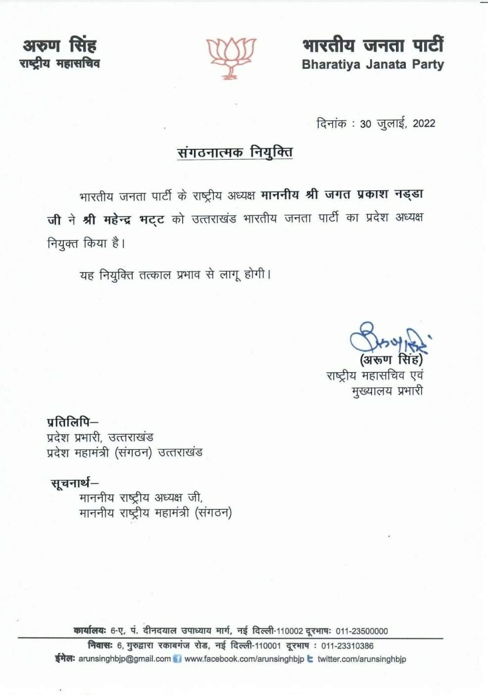 महेंद्र भट्ट को भाजपा प्रदेश अध्यक्ष मदन कौशिक के स्थान पर संगठन की जिम्मेदारी दी गई है। दिल्ली में बुधवार को भाजपा के पूर्व विधायक महेंद्र भट्ट की पार्टी के राष्ट्रीय अध्यक्ष जेपी नड्डा से मुलाकात हुई थी। जिसके बाद भाजपा के राष्ट्रीय अध्यक्ष जेपी नड्डा ने महेंद्र भट्ट को प्रदेश अध्यक्ष नियुक्त किया है। बता दें कि महेंद्र भट्ट दो बार के विधायक रह चुके हैं।