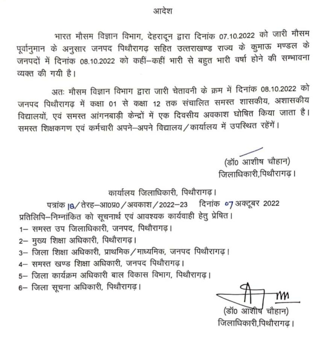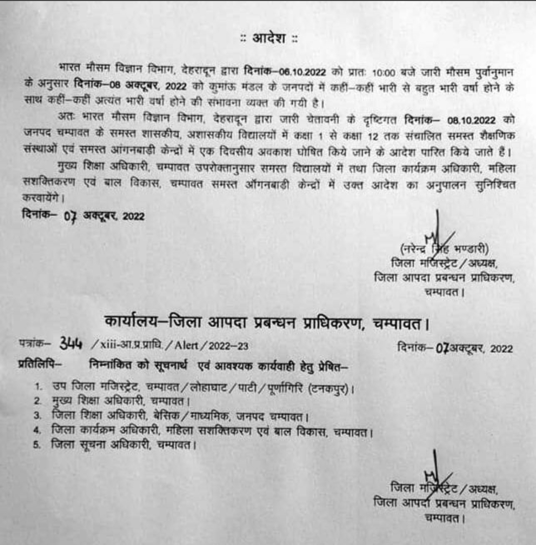 Dehradun: उत्तराखंड में शुक्रवार को मौसम विभाग की भारी बारिश की चेतावनी के चलते 7 जनपदों में स्कूल बंद रहे। वहीं मौसम विभाग ने शनिवार यानी 8 अक्टूबर को भी प्रदेश के 3 जनपदों पिथौरागढ़, चंपावत और पौड़ी जनपदों में कक्षा एक से कक्षा 12 तक के सभी स्कूलों तथा आंगनबाड़ी केंद्रों को बंद रखने के निर्देश दिए हैं। बागेश्वर में भी केवल कपकोट और शामा क्षेत्र में विद्यालय बंद रहेंगे। जिले में शेष जगहों पर स्कूल खुले रहेंगे।